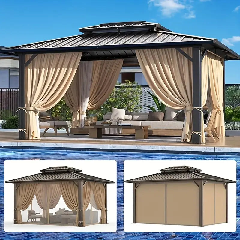 10x12ft Heavy duty hardtop gazebo with double roof, flame retardant curtains and netting, aluminum frame, outdoor gazebo for patios, lawns and backyards Brown color