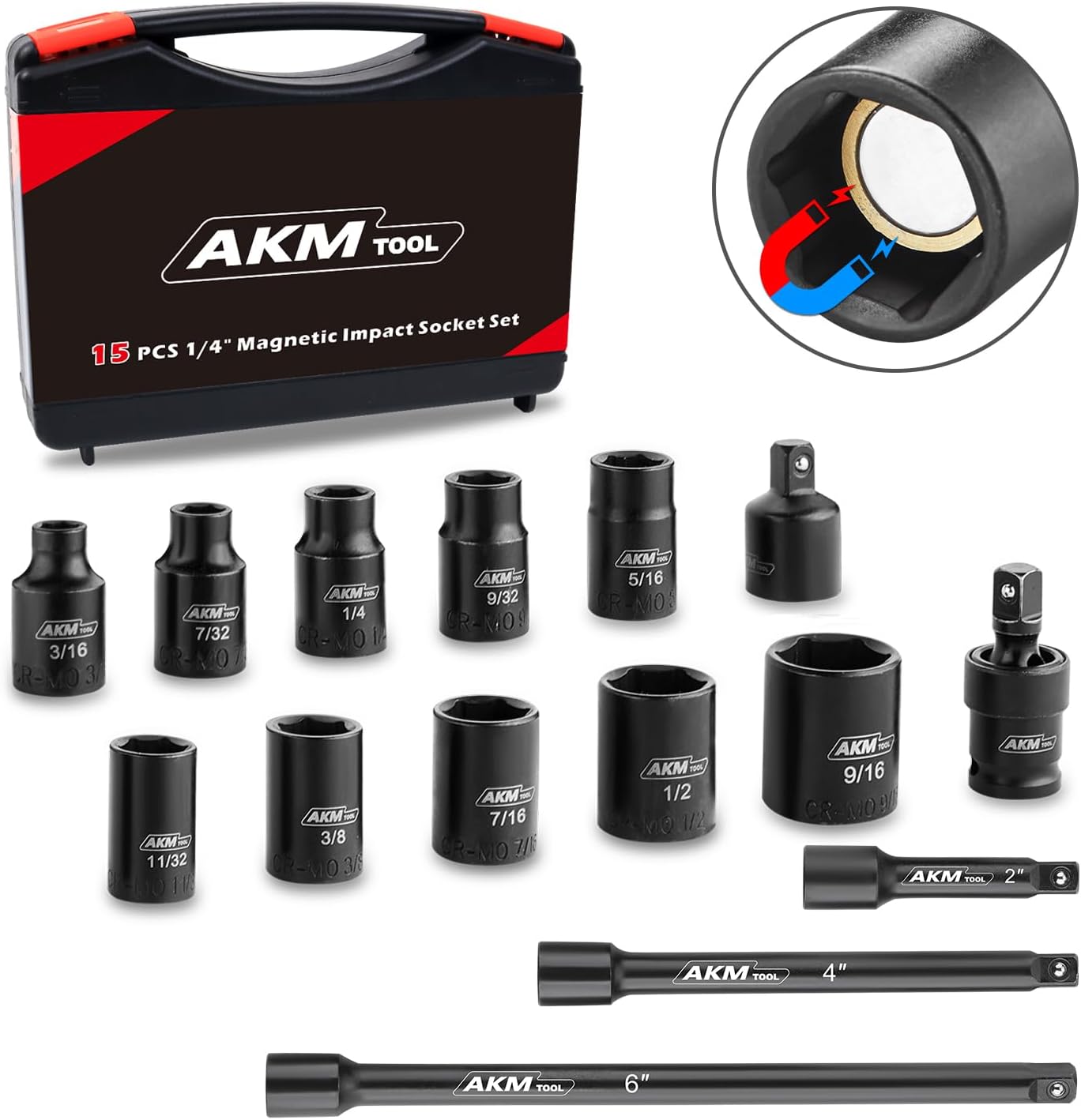 1/4 Inch Drive Magnetic Impact Socket Set, 15-Piece SAE, 1/4 Inch-9/16 Inch, 6 Point, Cr-Mo, Square Drive, Magnetic Socket with Impact Socket Adapter, Universal Joint & Extension