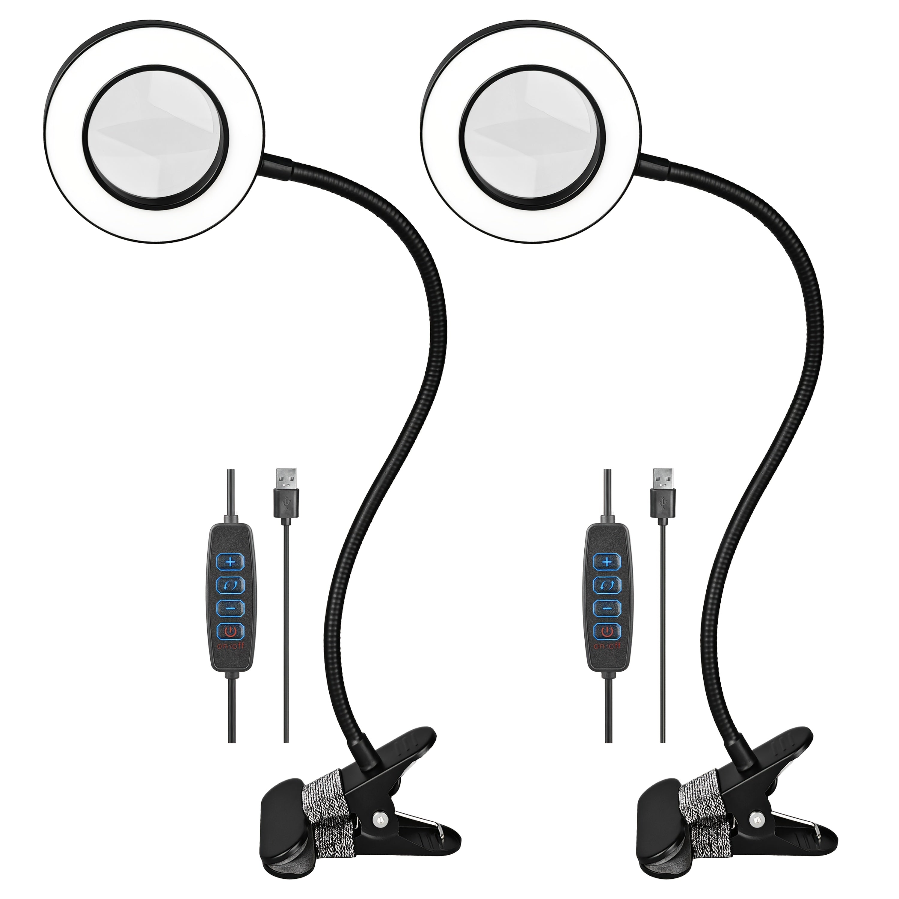 2pcs, 5X Magnifying Glass Lamp With Light Magnifier Light With Clip, Adjustable Flexible Gooseneck, 3 Color Modes Magnifying Lamp With USB Powered, Hands Free Desk Lamp For Hobbies, Crafts, Reading And Close Work Black