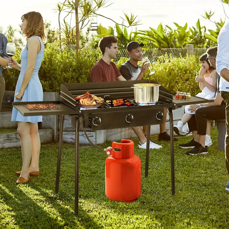 3 Burner With Side Shelves Wind Panels Propane Gas Stove For Outdoor Cooking 225 000 Btu Camping Cooker With Removable Legs Adjustable Psi Regulator For Backyard Cooking Bbq Baking Frying