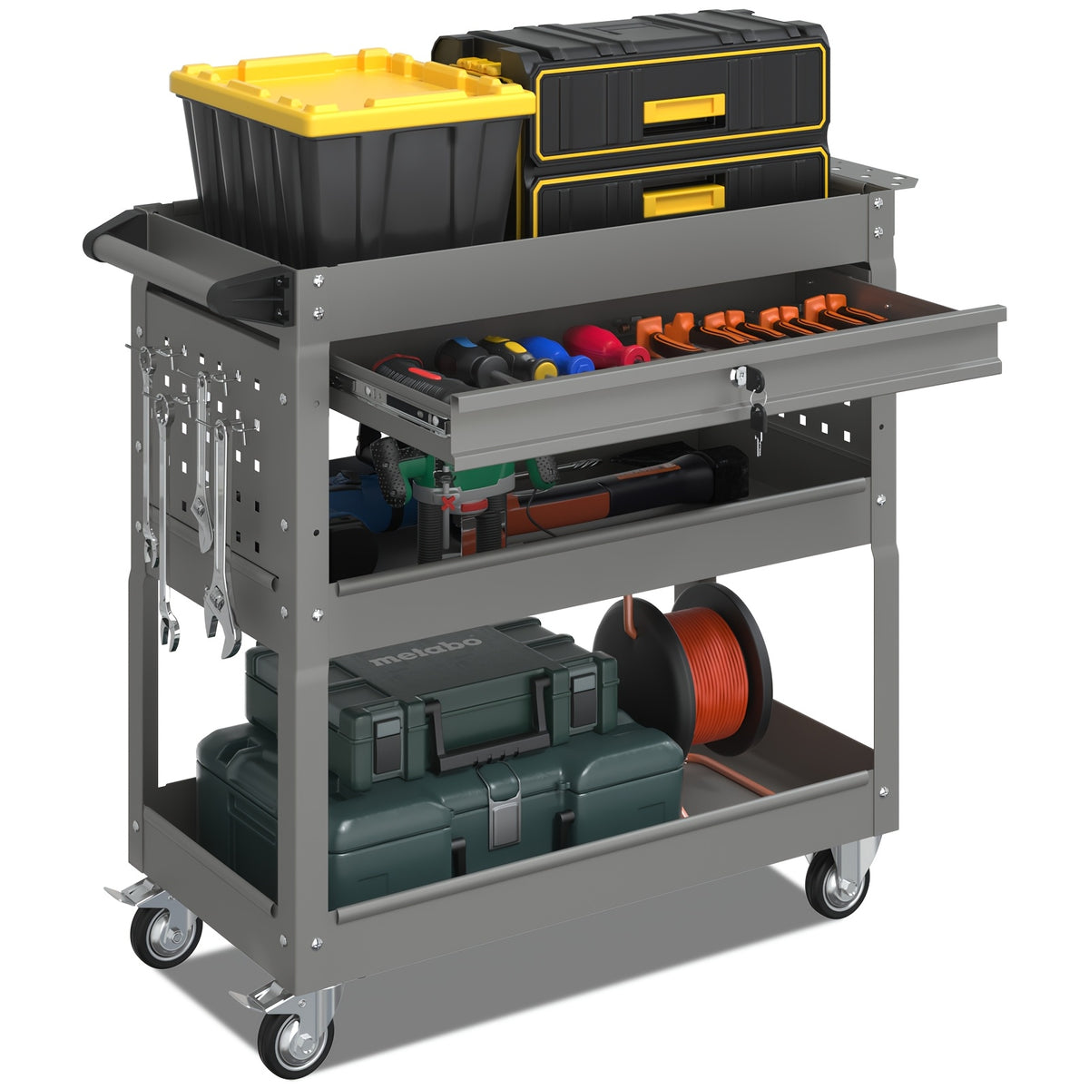3 Tier Tool Cart On Wheels With Lockable Drawer, 450 LBS Capacity Heavy Duty Utility Cart, Rolling Tool Cart, Industrial Commercial Service Tool Cart For Mechanics, Warehouse, Repair Shop Gray Color