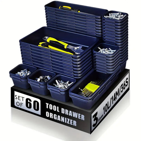 60pcs Set Plastic Tool Drawer Organizer Trays With 36 Compartments, Stackable Storage For Tools & Parts, Versatile Design Blue